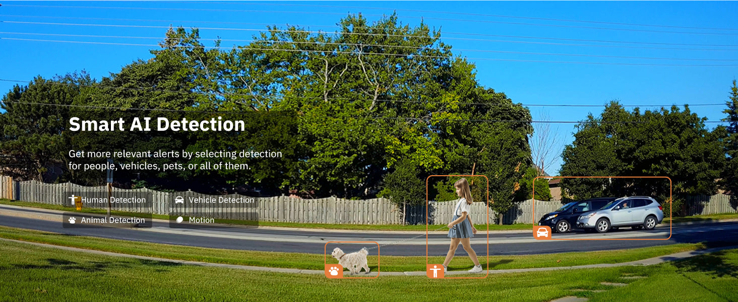 DETECTS PEOPLE, NOT CARS: Avoid unnecessary motion alerts. Person Detection Technology sees people and filters out the environment. Set a custom detection area for even more control